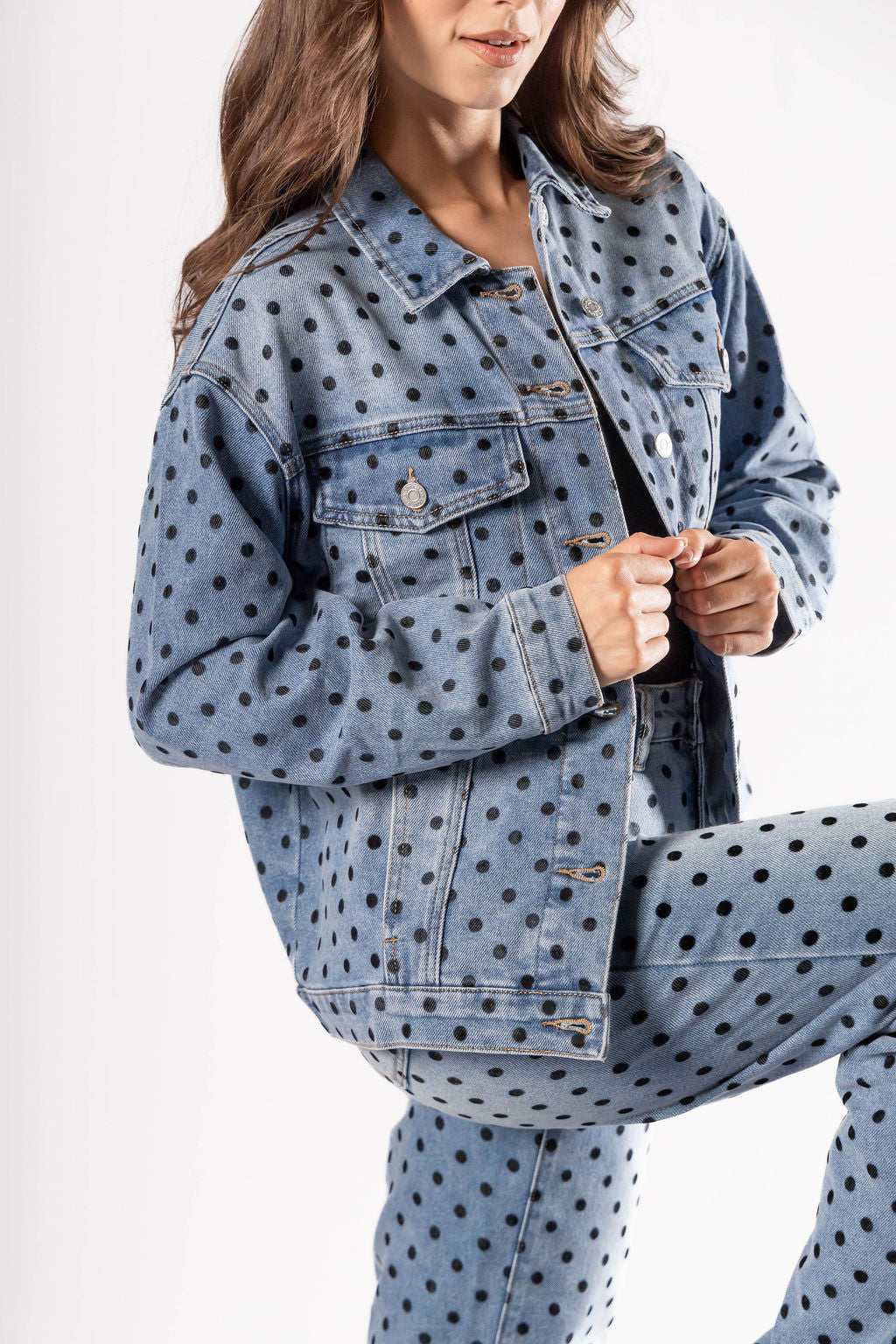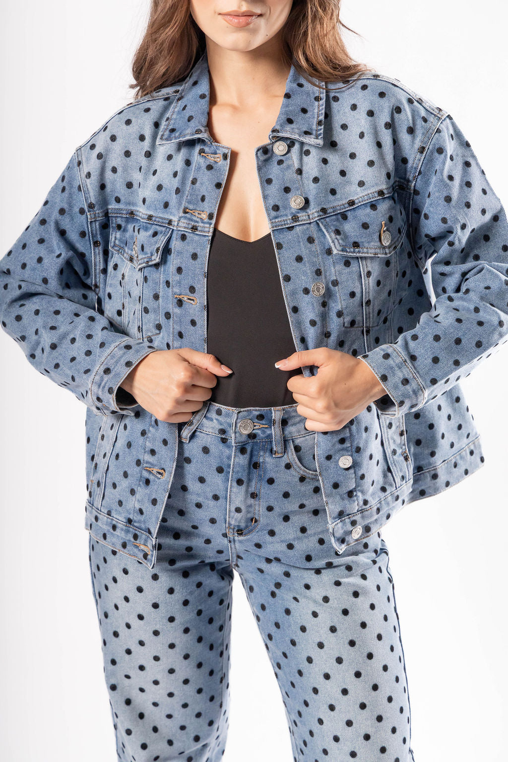 El denim de siempre, pero con personalidad. Nuestra chamarra Polka Denim le da un giro moderno y divertido a cualquier look con su estampado de puntos y su fit perfecto. Fácil de combinar, imposible de ignorar.