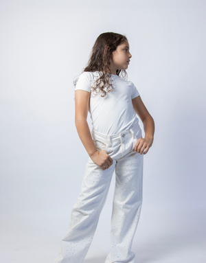 ¡Brillan tanto como ella! Este pantalón blanco con detalles de brillo es ideal para las pequeñas que aman destacar con dulzura.