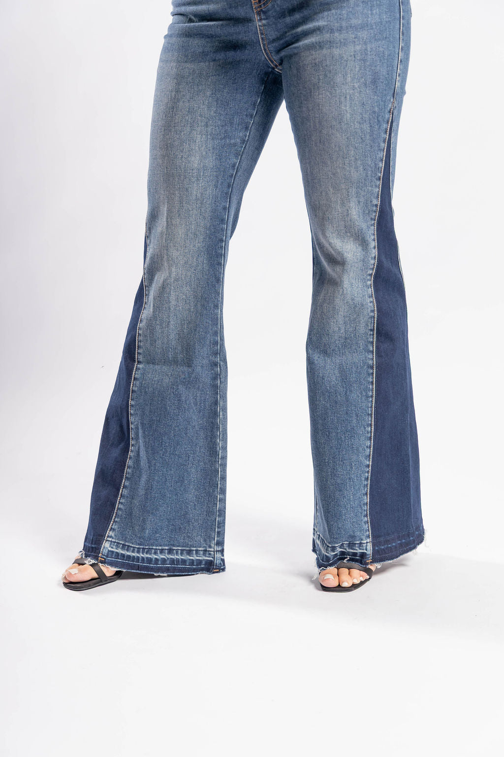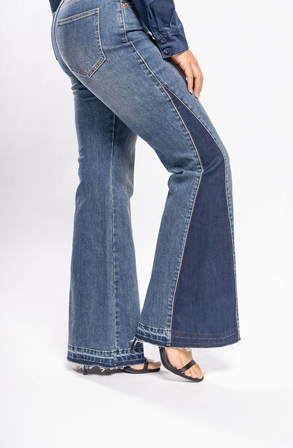 Luce increíble con estos jeans flare de cintura alta, diseñados para resaltar tu figura. Con paneles frontales en mezclilla oscura que crean un efecto visual único, son ideales para quienes buscan estilo con personalidad. Confeccionados en denim stretch para mayor comodidad y ajuste perfecto. ¡Hazlos tuyos y transforma tu outfit!