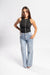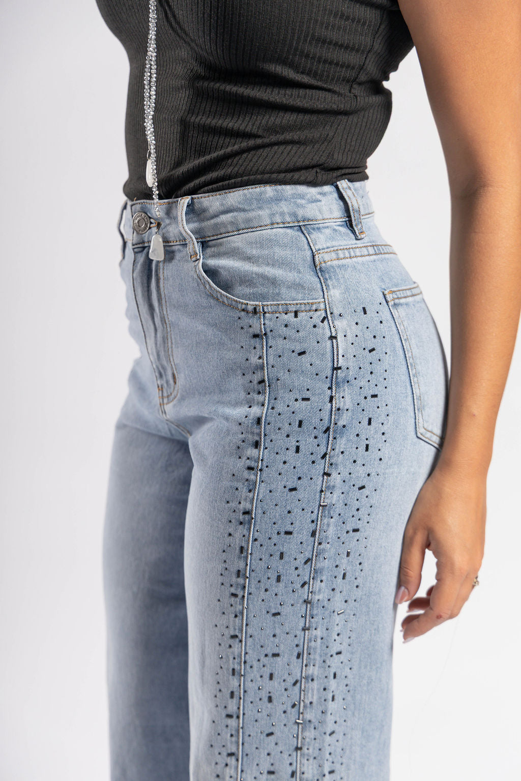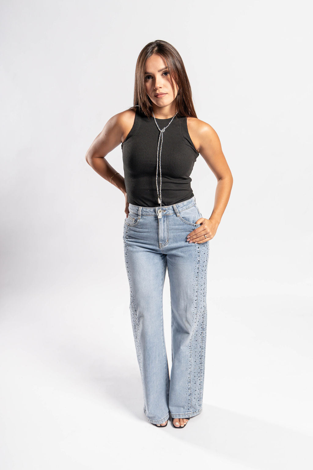 Dale un giro sofisticado a tu estilo con estos jeans de mezclilla azul claro, decorados con apliques negros que recorren los costados. Su corte wide leg y cintura alta estilizan la figura, mientras que los detalles oscuros aportan un toque glam y atrevido.