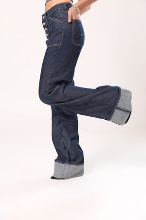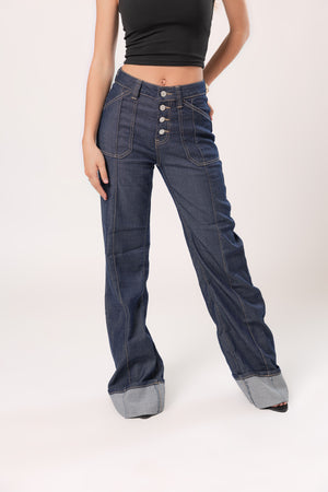 Pantalón wide leg con botones frontales y dobladillo volteado