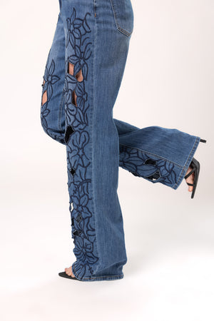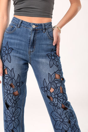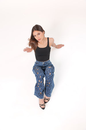 Tiro alto y silueta wide leg redefine lo clásico con un diseño floral calado que aporta textura, carácter y un toque inesperado. La estructura estiliza la figura mientras los detalles crean un efecto visual único en cada paso.