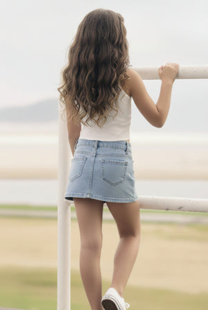 Short falda de mezclilla para niña en tono azul claro, con diseño cruzado al frente que simula una falda. Cómodo, ligero y fresco, ideal para looks casuales y para el día a día.
